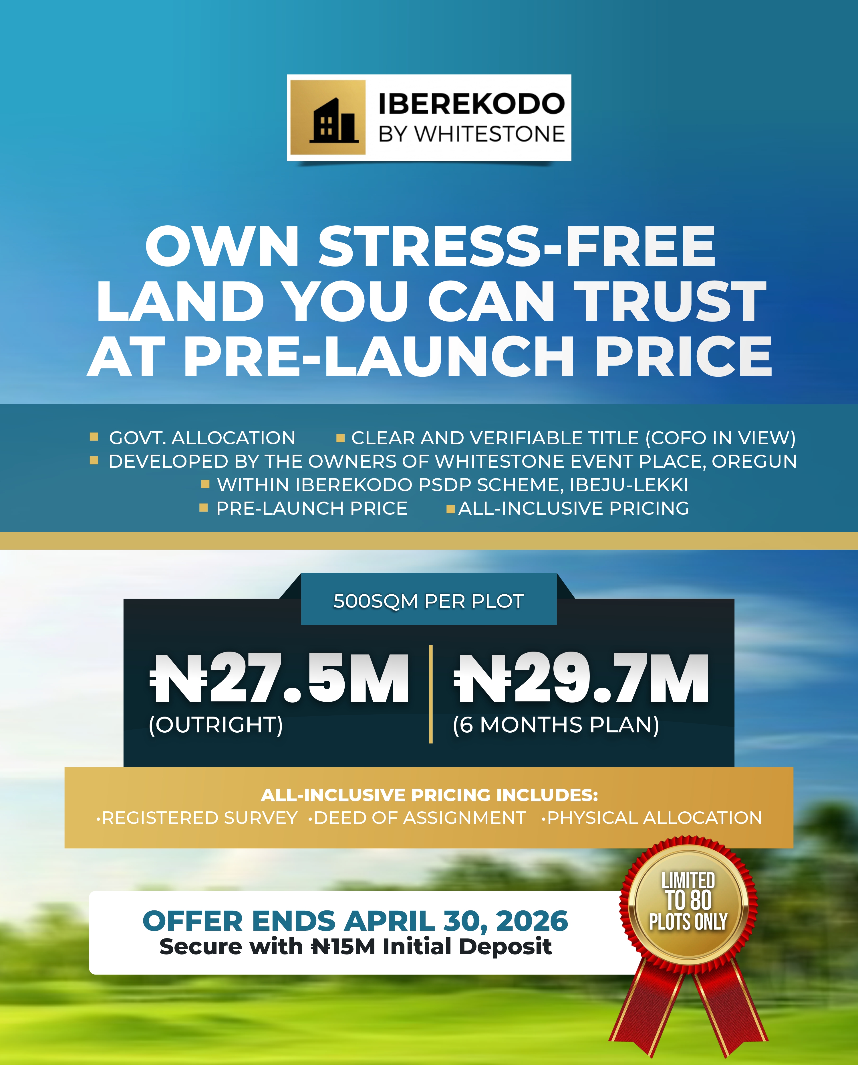 Because only 80 plots are available, early buyers are encouraged to secure their plots while allocations remain open.